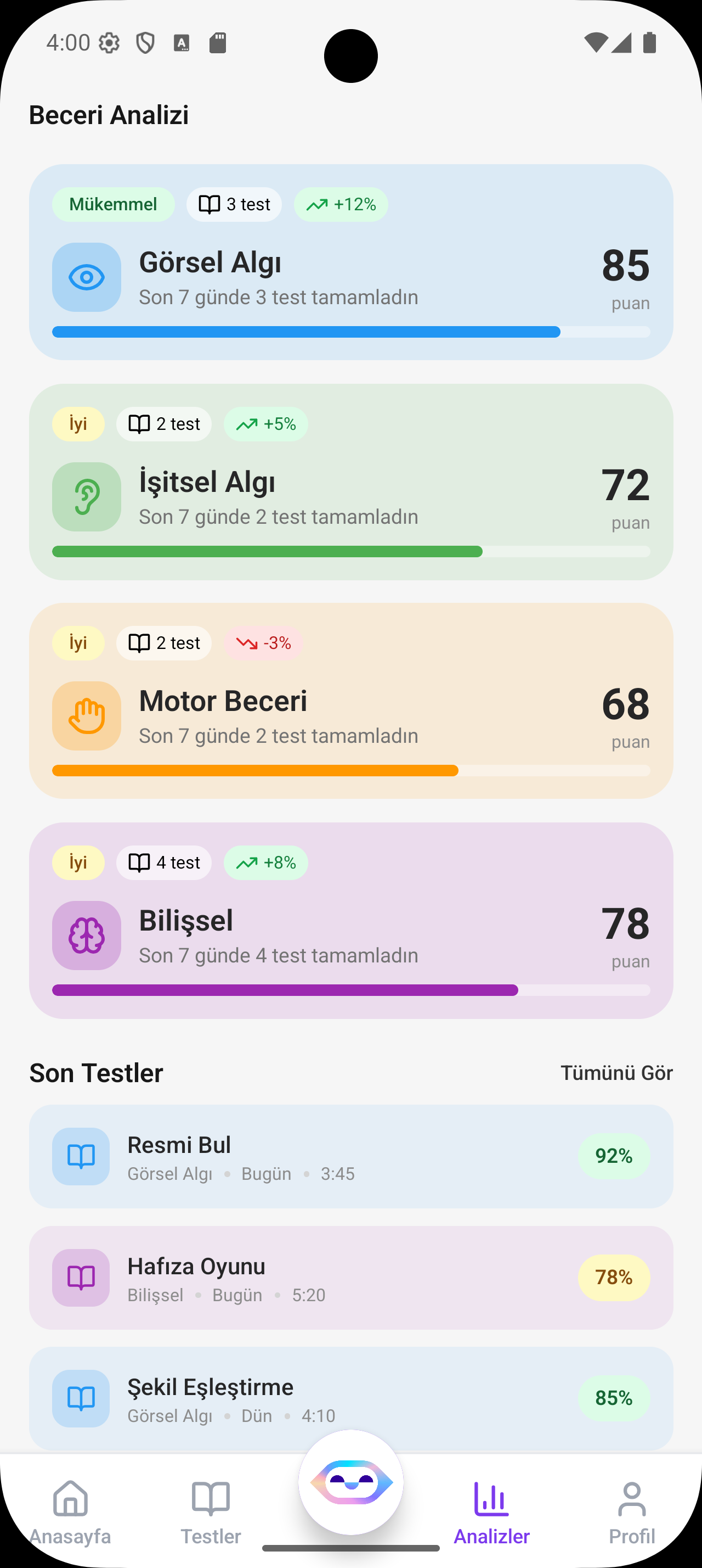 Korteks, elde edilen verileri sade ve anlaşılır gelişim raporlarına dönüştürür. Ebeveynler zaman içindeki ilerlemeyi net şekilde görebilir.